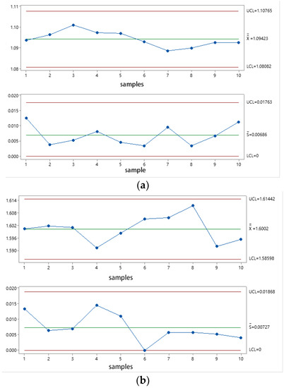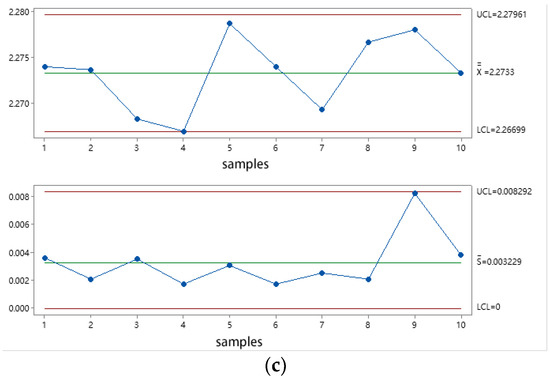 The mean–standard deviation control chart of the PCR test system for commercial vehicle brake chamber. (a) 0.3 MPa , (b) 0.5 MPa , (c) 0.7 MPa .