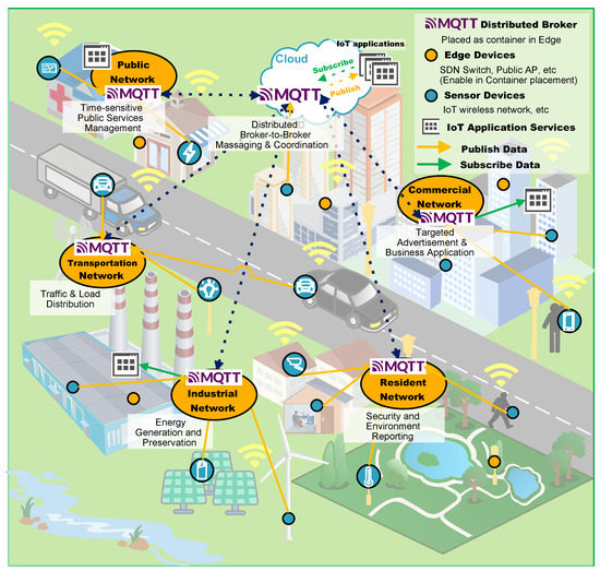 Meanwhile, software-defined networking (SDN) separates the control and data planes of network switches. An SDN controller sets forwarding rules to control the data plane flow. SDN enables the rapid adoption of new IoT protocols and policies. It can manage devices and networks based on statistics. A network computing resource could be provided by an edge-enabled SDN switch, which allows them to deploy container services. Edge computing can be used for crowdsensing [7]. Crowdsensing allows people with mobile devices to collect and share data to measure, analyze, and estimate common concerns. Applications of crowdsensing include noise pollution mapping, urban planning, and weather forecasting [8]. However, unexpected events may cause a data explosion. In this case, data can be processed locally using edge computing resources to reduce network traffic. IoT applications require a protocol with real-time response, low bandwidth, and low energy. The MQTT (message queuing telemetry transport) protocol is suitable for IoT. MQTT, a publish/subscribe messaging protocol for pervasive networks, can improve network bandwidth and device battery life [9]. MQTT organized data into topics and a publisher sends a message to the centralized broker to distribute data. The broker delivers data to topic subscribers and allows connecting many constrained devices and delivering data efficiently. MQTT has been used as a messaging protocol on IoT-based smart cities [10,11].