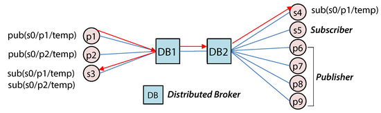 Figure 3 shows an operational example of an existing distributed broker architecture. MQTT clients (publishers/subscribers) are connected to DB1 and DB2, which are adjacent distribution brokers. When DB1 receives a message (e.g., s0/p1/temp) published by p1, it transmits the message to subscriber s3. It also transmits the message to DB2 to deliver to subscriber s4. DB1 needs to know that there is a subscriber to the topic published by p1 in DB2 in advance. Subscription flooding (SF) is used in the existing distributed broker architecture. The subscription message is sent to all distributed brokers to synchronize the subscription tables. Although there is a publication broadcasting method that broadcasts received publication messages to all distributed brokers regardless of the presence of subscribers, it is rarely used in the distributed broker architecture because of the flooding overhead of publication messages with a higher frequency than the subscription message. If the SF method is used on a distributed local MQTT broker in an edge computing environment, the distributed MQTT broker must keep a forwarding table for all MQTT topics. To work with the central broker, the local broker must forward all topic subscription messages to the central broker and maintain a subscription table for all central broker clients. Due to resource constraints, a single distributed MQTT broker container on an edge device cannot process all client subscription/publication messages. Synchronizing subscription tables between distributed broker containers also incurs additional overhead. If the computing resources required to operate a distributed broker exceed the network’s edge computing resources, the distributed broker cannot be deployed. This distributed broker architecture also wastes edge computing resources by processing/managing non-subscribed topic messages.