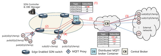 The distributed brokers in the network have delegated the processing of a specific set of topics (e.g., s0/+/temp) managed by the central broker. Upon delegation, the subscription table of the corresponding topic is received as (1), as shown in Figure 4. The central management entity in the network notifies the MQTT proxy that a specific topic has been delegated, and the MQTT proxy then forwards the publication message for that topic to the distributed broker where the topic is delegated, as shown in (2). DB1 delivers a publication message of the topic to subscribers in the network. If there is a subscriber outside, then DB1 sends the message to the CB, as demonstrated in (3). The CB is responsible for delivering the message to external subscribers. Except for delegated topics, messages are passed directly to the CB without going through DB1, as illustrated in (4). Through this operation process, the proposed distributed broker architecture manages only a specific set of topics. Thus, the number of messages to be processed by the distributed broker can be reduced compared to the existing distributed MQTT architecture.