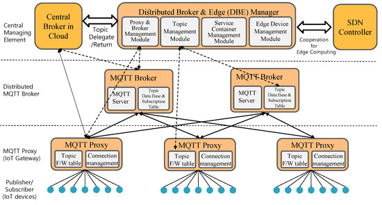 Based on considerations in the previous subsection, we propose a distributed MQTT architecture. The proposed architecture consists of distributed brokers and edge managers, distributed MQTT brokers, and MQTT proxies.