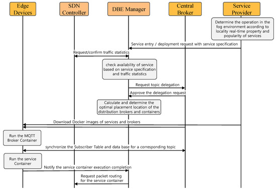This DBE manager is placed in the local network. It collaborates with the SDN controller to monitor and control the network’s edge computing resources. The DBE manager tracks all container resource usage in the network and tracks each edge device’s available resources. Like the SDN controller, the DBE manager is a local object that manages edge resources. Figure 6 shows the edge entry process of a specific application service in the proposed architecture. First, the service provider evaluates the operational necessity in the edge environment locality, real-time property, and popularity of the service. If it is determined that the operation is necessary for the edge computing environment, then the edge computing environment is established and checked in the network, and service entry and placement are requested through the API of the DBE manager. The DBE manager sets statistical conditions at the SDN controller to obtain traffic statistics corresponding to the service for a certain period. It is to check the traffic statistics used by the service in the current network based on the specification of the service. The DBE manager then determines whether it can deploy based on the current edge computing’s service description, traffic statistics, and available resource information. The DBE manager asks the central broker to delegate the topic if the placement is possible. Upon approval of delegation from the central broker, the optimal placement location of the distributed broker and service container is calculated considering the traffic statistics and available edge computing resources.