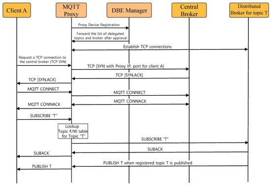 Figure 7 shows the operation procedure of the MQTT proxy-based client connection and subscription. First, when the proxy device initially connects to the network, it forwards the registration message to the DBE manager. The DBE manager sends the approval message and lists of delegated topics and distributed brokers. After that, the MQTT proxy establishes a TCP connection for client packet tunneling to the distributed brokers in the list. When the proxy receives a TCP SYN packet from client A, who wants to connect to the central broker, the proxy establishes a TCP connection with the central broker with a randomly generated port number (PORT_FOR_A) to identify client A. After the TCP connection to the central broker is established, the MQTT proxy establishes the TCP connection with client A. The proxy stores a table having a tuple of <A_IP, A_PORT, PORT_FOR_A> to identify the client. When receiving a subscription message of topic T from client A, the MQTT proxy checks the list of delegated topics and distributed brokers. If topic T is managed by a distributed broker, then the subscription message is transmitted to the corresponding broker in the form of [PORT_FOR_A, LENGTH_SUBSCRIBE_MSG, SUBSCRIBE_MSG] using the TCP connection established for tunneling. The distributed broker sends a reply for the subscription in the form of [PORT_FOR_A, LENGTH_SUBACK, SUBACK]. The proxy identifies the client through PORT_FOR_A and relays this message over the established TCP connection with the client. When a subscription-requested topic is issued, it is delivered in the same manner using tunneling.