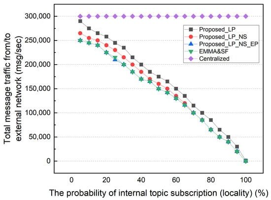 First, we performed a simulation based on the subscription’s locality. In this simulation, the locality of the subscription is the probability of subscribing to a topic published on the local network where the subscriber is located. Figure 8 shows the total network message traffic between external networks by subscription locality. In this simulation, subscribers choose whether to subscribe to internal or external topics, and the topics are chosen at random from the uniform distribution. The simulation default setting for a central-broker-only architecture, which is denoted by “centralized” in the legend, is 10,000 publishers per network, one topic per second, and two subscribers per topic, resulting in 300,000 external network traffic items. In an environment with a very low locality of subscription at 5%, the LP scheme shows the highest external traffic, similar to that of the CB architecture. The NS scheme generates the next highest amount of external traffic. EP delegated all topics reducing external traffic. Therefore, it shows the same external traffic as EMMA and SF. As stated previously, the EMMA and SF methods generate identical external traffic except for subscriber table maintenance overhead and subscription message forwarding.