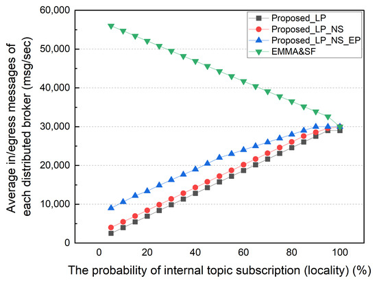 The amount of external traffic decreases as the subscription locality increases. The external traffic of all schemes is zero except for LP in a 100% locality of the subscription environment. Throughout LP, unsubscribed topics are sent directly to the CB rather than processed by the distributed broker, resulting in additional external traffic. An environment with 100% locality of the subscription is not realistic. As there is no need for distributed broker collaboration, an MQTT broker that operates independently for each network can be used. However, the existence of subscribers and services using various data published by different sources, such as a smart city environment, requires distributed broker collaboration. Figure 9 shows the average number of ingress/egress messages per distributed broker by locality. This result confirms the advantage of the distributed MQTT architecture proposed in this paper. Due to the fact that LP only delegates topics to internal subscribers, the average number of ingress/egress messages is significantly lower. NS and EP show significantly less MQTT messages processed by a distributed broker than EMMA and SF.