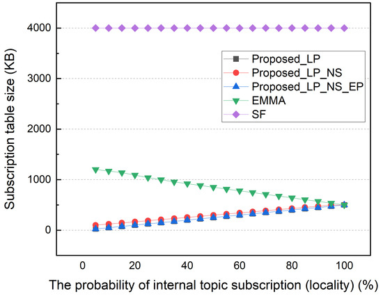 First, we performed simulations to compare the proposed distributed MQTT architecture to EMMA [19] and the SF method, which was described in Section 3. EMMA was chosen because it proposed a distributed MQTT broker that was dynamically allocated. EMMA moves clients to adjacent distributed brokers using gateways and allowing for dynamic creation and destruction of distributed MQTT brokers. When issuing/subscribing to a topic, EMMA behaves like SF. Unlike SF, EMMA does not flood externally for local topics because it assumes that local and global topics are separated beforehand. Consequently, the two methods differ in the size of the distributed broker’s subscription table. Although this is different from the proposed environment, which does not distinguish between global and local topics in advance, we performed simulations assuming that the topics that are not subscribed to by clients in external networks are local topics. Table 2 lists the simulation parameters. We modeled the behavior of subscribers/publishers and brokers in each architecture using MATLAB 2017a. Our experiment simulates IoT properties in a smart city environment, with a large number of devices, large amounts of data sharing, easy creation and removal of services, and multiple network owners. Thus, we test on a large number of devices in a multiple network set with 10,000 publishers and subscribers with 200 subscribed topics each. The topic name was 40 bytes long. The topic set the length for storing subscriber information at 6 bytes (4 bytes for IPv4 address and 2 bytes for TCP port). In a real environment, a larger memory and storage space is required for maintaining a subscription table, such as a hash table, subscriber information table, and topic tree information. In particular, a database for a topic with a Retain field set requires a lot of storage space. The size of the subscription table was calculated using the minimum amount of data that must be kept in memory. The policy determines which topic a distributed MQTT broker delegated. In this paper, policies are divided into three categories: Proposed LP, Proposed LP NS, and Proposed LP NS EP. Proposed LP represents a policy that delegates only those topics that have a pair of subscribers and publishers within the local network. Proposed LP NS represents a policy that delegates not only topics delegated by Proposed LP but also delegates topics that are currently published in the internal network but do not have subscribers. Proposed LP NS EP represents a policy that additionally delegates topics that are published from external networks but have two or more subscribers in the local network. Hereinafter, Proposed LP, Proposed LP NS, and Proposed LP NS EP are denoted by LP, NS, and EP, respectively.