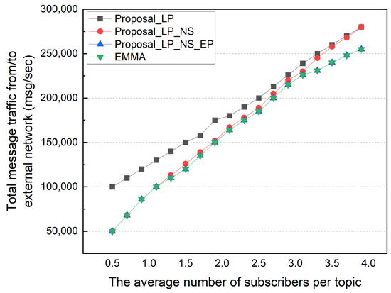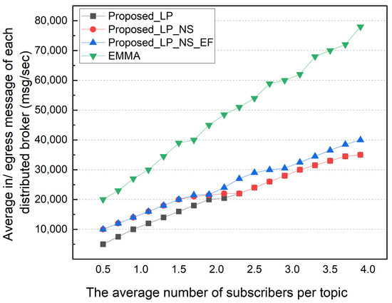 Afterward, we performed a simulation based on the average number of subscribers per topic. The number of subscription topics per subscriber was changed from 50 to 400, so the average number of subscribers per topic varied from 0.5 to 4.0. The locality was fixed to 50% in this simulation. Figure 11 shows the total external message traffic according to the average number of subscribers per topic. As the number of subscribers increases, the total external message traffic gradually increases. The EMMA and EP methods show the same total external message traffic. In an environment with an average of 0.5 subscribers, the LP method has twice the external traffic as the other methods. This is because of a high portion of topics with no subscribers in an environment with a low average number of subscribers per topic. The NS, EP, and EMMA schemes with no subscribers show low external traffic. As the average number of subscribers per topic increases, this difference is somewhat reduced; and in an environment with 3.9 average subscribers per topic, the total external traffic in the NS and LP schemes is nearly identical. The difference between the NS and EP methods increases as the average number of subscribers per topic increases. This is due to an increase in the number of topics with multiple subscribers in the local network that are published externally. Figure 12 shows the average ingress/egress messages per distributed broker based on the number of subscribers per topic in the same simulation environment. Similar to previous results, the number of messages processed in each distributed broker increases as the average number of subscribers per topic increases. When compared to EMMA, the EP method has a lower average number of messages processed in each distributed broker, despite having the same total external traffic results.