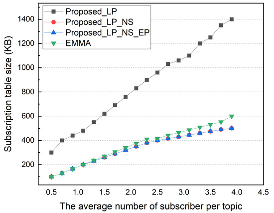 In addition, as the average number of subscribers per topic increases, it can be seen that the EMMA increases with a higher slope than the proposed method. Figure 13 shows the size of the subscription table based on the average number of subscribers per topic. A pattern resembling previous simulation results is seen. The NS and LP schemes share the same subscription table size because topics without subscribers are not maintained. Although the size of the storage for topic data is not evaluated in this paper, there is a difference in space for storing topic data when the retained field is set. Similar to previous simulation results, EMMA’s subscription table size increases with a higher slope than the proposed architecture as the average number of subscribers per topic increases.