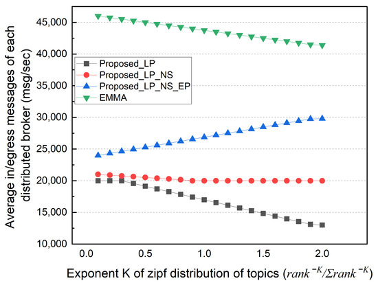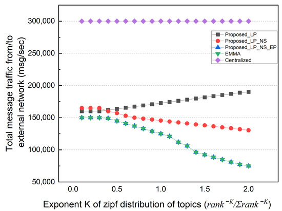 Finally, we performed simulations based on the topic’s popularity distribution. In this simulation, the subscriber selects a topic based on the Zipf distribution probability () rather than selecting the topic with a uniform distribution probability. The popularity concentration represented as K defines the intensity of the popular topic to be selected. The value of K varied from 0.1 to 2. Topics with a higher popularity rank are selected more intensively as K increases. If K is very small, it becomes close to a uniform distribution. In this simulation, the subscription locality was fixed to 50%.