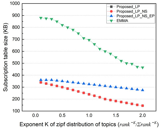 Figure 14 shows the total external message traffic as K changes. The EMMA and EP schemes have the same total external traffic, which decreases as the popularity concentration of each topic increases. Even if the topic is published by an external network, the EP scheme can deliver it to multiple subscribers in the local network with only one reception. In contrast, as the K value rises, the number of topics with no subscribers increases. Therefore, the total external traffic of the LP scheme increases, but the total external traffic of the NS scheme decreases. Figure 15 shows the distributed broker’s average number of ingress/egress messages. In the EP method, the distributed broker’s average I/O messages increase as the external traffic decreases. Similarly, in the LP method, the number of messages that a distributed broker has to process decreases as much as the number of external traffic rises. Because EMMA can deliver the topic to multiple subscribers in the local network with only one reception, the average number of ingress/egress messages decreases with increasing popularity concentration. Figure 16 shows the size of the subscription table in the same simulation; the table size decreases as K increases. As the number of unsubscribed topics increases, the number of topic lists to keep in the subscription table decreases. Furthermore, the number of subscribers to the same topic grows. The topic name is longer than the subscriber information in the simulation, increasing the subscription table size.