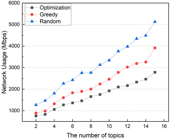 The workload of distributed MQTT brokers and IoT service containers depends on input traffic. Thus, computing resource usage increases power consumption. When the number of topics is small, the optimization and greedy methods are similar. When the number of topics is small, the network traffic between the MQTT broker and the IoT service container is small. However, as the number of topics grows, the power consumption difference between greedy and optimization methods grows. An increased number of topics increases the interdependency of MQTT brokers and service containers. The greedy method uses more power than the optimization method because it places containers without considering interdependencies between MQTT broker and IoT service containers. Figure 18 shows the average network usage in this simulation, which follows the same trend as the power consumption. Unlike the greedy method, the optimization scheme determines container placement while considering interdependency between distributed broker and IoT service containers, resulting in lower power consumption and reduced network traffic.