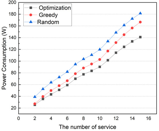 Figure 20 shows the simulation results according to the number of services. In this simulation, the number of edge devices and topics is fixed at 6, and the average topic utilization ratio is fixed at 20%. The number of services ranged from 2 to 15. As shown in Figure 20, the power consumption of all placement methods increases with the number of services. Since the service container generates more workload than the broker container, the overall power consumption is higher than in Figure 17. The greedy and optimization methods consume power in a similar way to the previous simulation on a number of topics. The simulation results show that the power consumption difference between the greedy and optimization methods grows as the number of services grows.