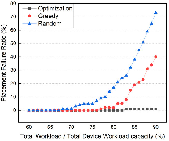 Then, we ran a simulation to see how the workload capacity of the edge devices affected container placement. Furthermore, the container placement method should be able to operate as many broker and service containers as possible without overloading the edge devices in the network. From this perspective, the optimization method may be superior to the greedy method. Figure 21 shows the container placement failure ratio according to the total edge device workload capacity. As shown in the graph, the x-axis represents the required workload for all broker and service container operations compared to the total workload capacity of all edge devices (WR). In this simulation, there were six edge devices, ten topics, and services. After the other simulation parameters were set to arbitrary values, the workload capacity of each of the devices was adjusted to a specific WR value. The simulation is performed 100 times for each WR. The container placement failure ratio was calculated by counting the cases wherein each method failed to place all the containers due to the edge device workload capacity. The random method fails to place containers at 70% WR in the simulation. The container placement failure ratio rapidly increases at 80% and reaches 70% when the WR is 90%. Since the greedy method places the container with the most workload first, it outperforms the random method. When the WR is 80%, the greedy method’s container placement failure rate increases. The greedy method also has a 40% placement failure rate at 90% WR. However, even at 90% WR, the optimization method shows low container placement failure rates. Despite its higher computational complexity and longer search time, these simulation results demonstrate the need for optimization-based container placement.