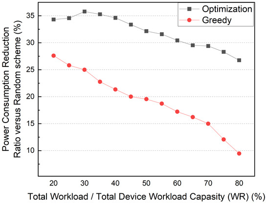 Our proposed scheme is compared to two other schemes. (i) The greedy method sorts distributed MQTT brokers and service containers in order of required workload, then allocates them sequentially with the lowest power consumption while considering the edge device’s remaining workload capacity. (ii) The random method arbitrarily allocates brokers and service containers based on the remaining workload capacity. The simulation parameters, such as device workload capacity and power efficiency, have arbitrary values. The result is a mean of at least 20 simulations.