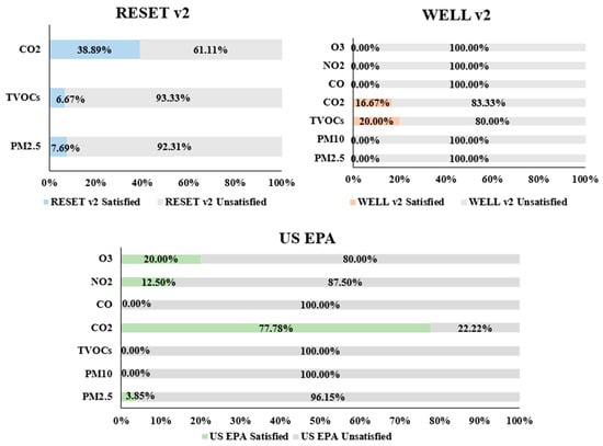 As shown in Table 3a, when assessing IAQ-related factors, different studies adopted various sensing modules, which may have different measurement ranges and accuracy rates. Given the three IAQ sensing standards reviewed in Section 3, Figure 3 illustrates the percentage of the reviewed sensor modules (with various tested air pollutants) that satisfied or unsatisfied the requirements of sensing standards US EPA, WELL v2, and RESET v2. The majority of the deployed IAQ sensors failed to fully meet the requirement of current commonly adopted IAQ sensing standards. Specifically, none of the sensing modules detecting PM10 satisfy any of the selected IAQ sensing standards. Sensors measuring CO2 have the highest percentage of fulfilling any one of the three IAQ sensing standards. Over 75% of the CO2 sensors meet the requirements of US EPA, while the percentage of CO2 sensors that satisfy the requirements of RESET v2 drops to 38.89%. Only 16.67% of the CO2 sensors meet the requirements of WELL v2.