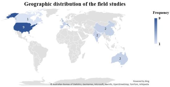 The studies analyzed and included in this review are reported from different locations of the world. Out of the 33 studies, 9 (27.27%) field studies were carried out in the United States, while the rest of the studies are scattered across different countries or regions, including China, Australia, and the European Union. Possible reasons that explain why more studies have been done in the United States is that the UIAQS technology is more advanced and acknowledged in the United States. Figure 4 represents the distribution of included studies throughout the world.