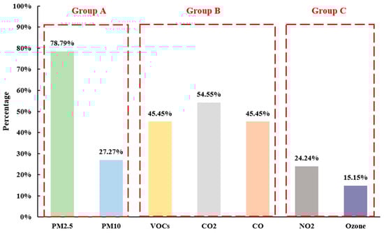 Figure 5 illustrates the main IAQ sensor types reviewed in this study. Seven types of IAQ sensors can be categorized into three groups. Specifically, sensors that take up more than two-third of the total analyzed IAQ sensing systems are in Group A. The most prevalent type of sensors-PM2.5 sensors are the only sensor type that can be included in Group A, which account for 78.79% (26 out of 33 articles) of the total IAQ sensing systems. Group B includes the types of IAQ sensors that contribute to more than one-third and less than two-thirds of the analyzed IAQ sensing systems. In particular, sensors detecting TVOCs, CO2, and CO are in Group B, which hold 45.45%, 54.55%, and 45.45%, respectively. The last group—Group C—are those types of sensor that take up less than one-third of all the IAQ sensing systems, which include NO2 and O3 sensors.