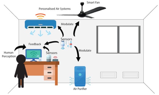 Relatively high airspeeds (generated by ventilation systems) and humidity impact both IAQ and thermal comfort at the same time. In most buildings nowadays, however, we have relatively low air speeds and an approximately fixed humidity, and the interrelationships become less prominent. In this case, thermal comfort is primarily impacted by air temperature [91], while IAQ is dominated by air pollutants and odor. To optimize IAQ, thermal comfort, and building energy simultaneously, we may need to adjust airspeeds, humidity rates and temperature accordingly to occupants’ instant needs, and that requires more sophisticated and comprehensive control systems, which require utilizing personalized sensors and actuators [92,93,94,95].