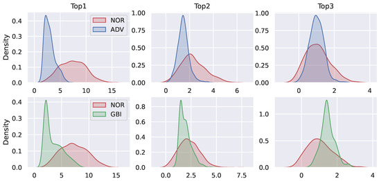 In Figure 1, TOP1, TOP2, and TOP3 indicate the top 1 value, the top 2 values, and the top 3 values of the model outputs, respectively. NOR, ADV, and GBI represent normal data, adversarial examples, and fake images, respectively. ADV and GBI are generated by DeepFool [15] and WGAN [40], respectively. It can be seen from Figure 1 that there are significant differences in the distribution of model outputs between the normal images and the adversarial examples (fake images).