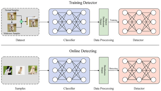 To solve the above issue, we explore the detection methods for adversarial examples and fake images. Inspired by membership inference attacks that use the model output to determine whether a sample belongs to the training dataset [21], we observe that there are also differences between the model outputs of normal samples and adversarial examples (fake images). Specifically, the distribution of model outputs is fit using the kernel density estimation. We propose a universal detection method for adversarial examples and fake images based on this difference. This method includes the detector training algorithm and online detection algorithm. The detector training algorithm is used to construct the model output’s dataset and train the detector. This dataset consists of the model outputs of normal samples and adversarial examples (fake images). In addition, the detector is trained to learn the rule of the output distribution of normal samples and adversarial examples (fake images). The online detection algorithm is to obtain the model outputs of samples and calculate detection results. To the best of our knowledge, Li’s method is similar to ours [22]. However, he uses the middle-layer features of the Bayesian neural network to determine normal samples and adversarial examples, and we use the output of the deep neural network. Moreover, our method is not only suitable for the detection of adversarial examples, but also for the detection of fake images.