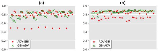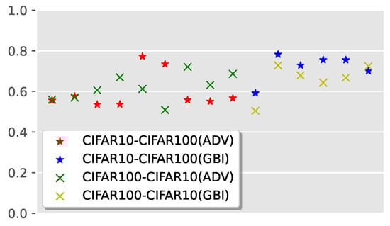 The generalizability of the detector mainly includes (1) the generalizability of datasets; (2) the generalizability of target model architecture. In addition, the generation methods of adversarial examples and fake images are DeepFool and WGAN [15,40], respectively. In addition, we have to describe the experiment case in the form of condition I–condition II. For example, CIFAR10–CIFAR100 represents that the detector is trained by CIFAR10 and evaluated by CIFAR100. Limited by the two time-scale update rule (TTUR), we only use AutoGAN [41] and TransGAN [42] generators on the CIFAR10 dataset. Below, we provide a detailed introduction to the experimental content.