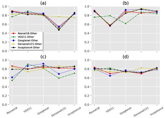 We selected five neural network structures to verify the generalizability of the target model structure, including Resnet18, VGG11, Googlenet, Densenet121, and Inceptionv4. Specifically, we first selected one of the network structures as the target model, one after the other in turn, then used the output of the target model to train the detector, and finally used the remaining networks to evaluate the generalizability of the detector. The experimental results are shown in Figure 4.