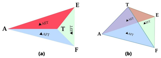 There are two possibilities shown in Figure 4 about the position of a random node T which lies inside and outside, respectively. The node T will be allowed to participate in the communication process if it lies inside the trilateral region or else it will be dropped. Equation (18) is used to determine whether a node is located inside or outside the trilateral region.