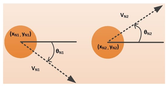 specifies the minimum duration amongst all connections between the source and target node, whereas specifies the estimated duration for which the connection between any two nodes stays active []. A route with a higher is a considered a more dependable route. Figure 5 illustrates two nodes [], i.e., where node has coordinates along with the velocity which moves at an angle whereas node have coordinates along with the velocity which moves at an angle . Furthermore, both nodes have same the communication range R. Then, the between two nodes can be calculated using Equation (21).