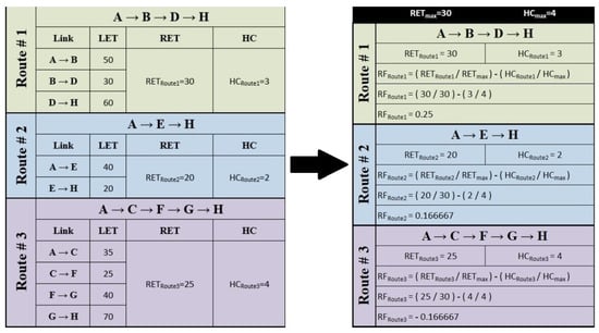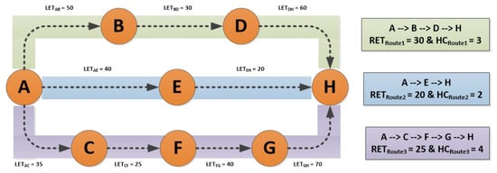 is the highest value of across all possible routes at the destination (which can be calculated using Equation (23)). As explained earlier, the between any two nodes can be acquired using Equation (21) and the minimum in the possible route tagged as the of that route. As depicted in Figure 6, multiple possible routes are available if node A aims to send data to node H. The connection between any two nodes signifies the of both nodes, for example, the between node A and node B is equal to 50.