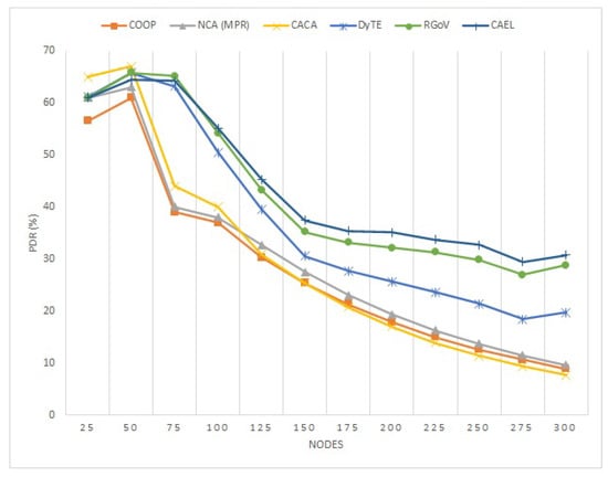 This section examines the effect on the performance of RGoV [], DyTE [], COOP [], NCA(MPR) [], CACA [], and CAEL at various network densities. The network density has been demonstrated by deploying up to 300 nodes over an area of 2500 m × 2000 m. Every individual node in the network may travel at a maximum speed of 50 km per hour. Between random source–destination connections, a maximum of 100 connections are established with the packet 512 bytes in size.