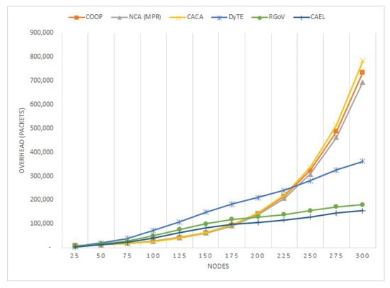 COOP, NCA (MPR), and CACA are solely based on improving the MPR selection to reduce the network overhead, whereas DyTE and RGoV control overhead packets using the time and distance information of the nodes, and RGoV also adds a clustering technique on top of that to improve the performance by adding a reliability factor. The proposed protocol (CAEL), on the other hand, not only minimizes the communication region but also checks the link expiration of each connected route to determine the best possible way to reach the destination. The results show that the overall performance of CAEL is far more effective than that of COOP, NCA (MPR), CACA, DyTE, and RGoV.
