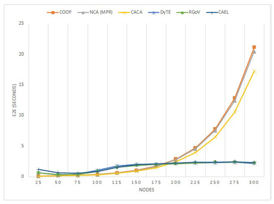 The average E2E latency is depicted in Figure 10 for various node counts. Since the proposed protocol is based on the compaction of the communication region, when the node density is low, the number of nodes participating therefore also becomes very limited and even no node participates in the communication process, which leads to an increase the latency time. It can be seen that with the rise in nodes count, the E2E latency for all protocols increased but due to the dependable route selection, the CAEL took roughly the same amount of time on average to transport the data packet as the RGoV and DyTE. In contrast, CAEL easily outperformed the remaining COOP, NCA(MPR), and CACA protocol because CAEL works on the principle of minimizing the communication region of a node and also selects the best route based on the availability of the link before its expiration.