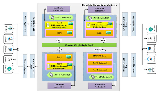 The Blockchain transaction (TX) only records the orderer details along with the hash value of participants ID, as shown in Equations (6) and (7). Deploying any EHR application on a single host machine with multiple peers, organizations, and orderers does not necessarily constitute a decentralized application. The network model, participants, assets, and transactions have been discussed to justify the applicability of the proposed framework.