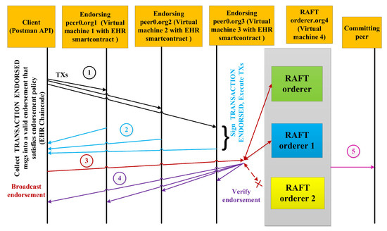 In this section, a Hyperledger Blockchain-based EHR application is proposed for various hosts with an efficient RAFT orderer, as depicted in Figure 1. The organizations with multiple peers are proposed in four virtual machines (VMs) in the Google cloud platform. Organization 1 (Org 1) is designed to be hosted on a Virtual Machine (VM) 1, organization 2 (Org 2) on VM 2, Org 3 on VM 3, and orderer services org on VM 4. Different services communicate with each other via the docker swarm network. Dedicated certificate authority for each organization has been designed. Peer 0 is intended to be an endorsing peer, where EHR smart contract resides and peer 1 is an anchor peer. Each peer is proposed to have the current state database as the couch DB. The sequence of our proposed work is the creation of a channel; then, each peer must join the channel, install the EHR chain code, approve the chain code, commit the chain code if it gets sufficient approvals from the organization, invoke the chain code, query the chain code and enable client communication with Postman API. Figure 2 depicts the transaction flow sequence of the proposed framework and the fault-tolerant capability of the RAFT orderer. It shows that if any one of the orderers fails out of three orderers, still, the transaction endorsing and committing takes place. Although there are several ordering services to handle transactions and configurations, a RAFT orderer has been proposed for the following reasons. It is an efficient crash fault-tolerant (CFT) algorithm that follows the leader and follower concept, where the follower follows the decisions made by the leader node elected per channel. It is designed to handle the distributed applications. The Kafka also follows the leader and follower principle but utilizes Zookeeper ensembles and a broker, which creates an overhead with respect to transaction latency and throughput. SOLO ordering services are only used for testing purposes, not for production, as its designed principle is based on a single organization with a single peer. RAFT provides a strategy for high availability for ordering services because of its endorsement policy of majority voting.The Genesis block was offered and executed after creating the crypto materials shown in Figure 3. The proposed framework has been evaluated using Caliper, and network traffics have been analyzed for the Gossip protocol.