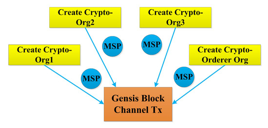 The environmental variables are set in docker-compose.yaml so that it can export the services to the 7054 port number. The instances are started; thereby, the certificate authority 1 (CA1) creates the own public and private key and self signs the certificate. The command docker-compose up-d was executed to create a fabric CA materials. The key-store inside the generated CA materials contains the private key. The create certificate script file contains a method named createcertificateOrg 1( ), where it enrolls the admin identity running on the 7054 port, which is the host-provided TLS certificate to communicate with Org 1. Finally, the node organization unit contains the nodes such as the peer, admin, client, and orderer. While registering, the peer’s CA details, ID name, password, TLS certificate have been provided. The same process was followed by other peers, users, and admins. To create the peer 0 membership service provider (MSP), the peers, users, and admins are enrolled. The peer TLS certificate has been generated, which is used to communicate between two peers of the same organization or with a different organization. Running the script ./create-certificate-with-ca.sh creates a crypto configuration folder, and all the certificates are generated. All the node organization unit materials related to CA, MSP, peers, TLSca, and users for organization 1 have been received. In the same way, crypto materials are created for organizations 2 and 3, and the services are exported to port numbers 8054 and 10054, respectively.