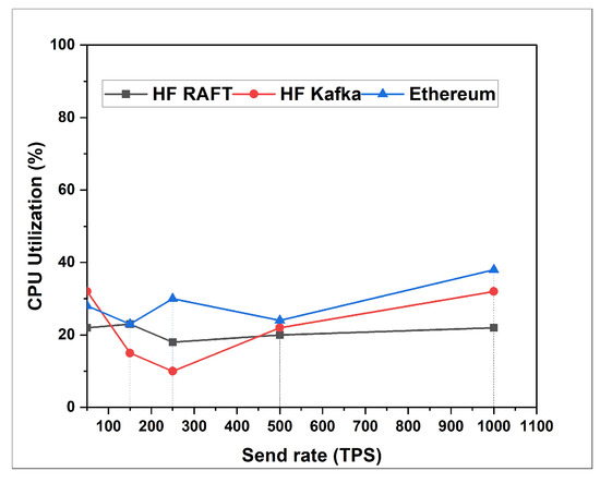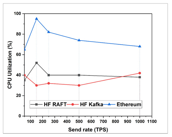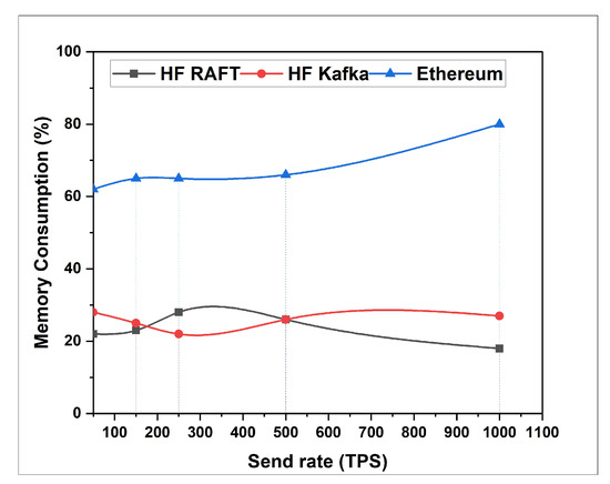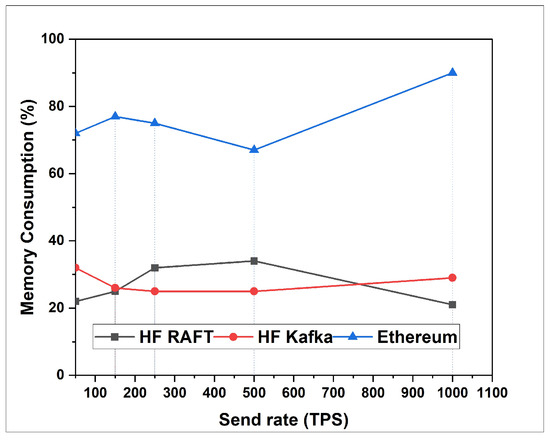In this section, the network resource cost of transactions and traffic inside the fabric multi-host network has been analyzed. Performance comparisons are presented for a Blockchain network with RAFT orderer. Figure 4, Figure 5, Figure 6, Figure 7, Figure 8 and Figure 9 depict the performance benchmarking of different blockchain platform such as Hyperledger Fabric RAFT, Kafka and Ethereum with respect to throughput, memory consumption, latency, and CPU utilization. In all case we found that the proposed framework works fine in terms of low latency, high throughput and low memory and CPU utilization.