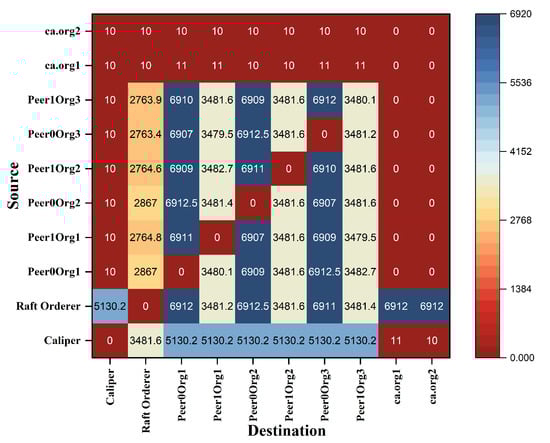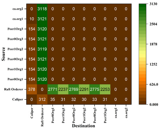 Hyperledger Fabric 2.0 generates a background network while communicating from one peer to other peers in the network. Without measurement of Gossip traffic, it is tough to measure the other background traffic associated with transaction and block distribution. This work performs a network traffic analysis between all the peers, organizations, and virtual machines during an ideal period of Fabric 2.0. So that it prevents the background traffic from interfering with other traffic, this work has not used Hyperledger Caliper during this measurement. Through tcpdump, the transnational traffic has been measured by gathering the PCAP files. The Fabric 2.0 network takes a little time to settle, and the network was started and waited for some time. The start of the fabric network generates extra traffic. A delay has been introduced in order to avoid the mixing of transnational traffic with other traffic. The results are with a delay of two minutes. Although most of the Fabric network communication utilizes the TCP protocol, we used a packet filter to capture the SSH traffic and the peers traffic. All the individual pcap files are collected along with merged pcap files, which have been trimmed to force the virtual instances to report data from equal time spans. The Wireshark CLI tool is used to merge and trim the files. A merged pcap file was analyzed, and Gossip protocol was calculated. We found that the transnational traffic is more intra-organizational than inter-organizational. As noticed, the data transmission among the caliper client and other organizations, peers, and orderers is exceptionally high. This work discovered that most of the traffic is not created by transactions. This work filtered out this traffic to obtain results from the transaction alone. Figure 10 and Figure 11 represents the heatmap of transaction traffic for SOLO and RAFT ordering.Figure 12, Figure 13, Figure 14 and Figure 15 depict the virtual machines communication with respect to caliper client and RAFT orderer.