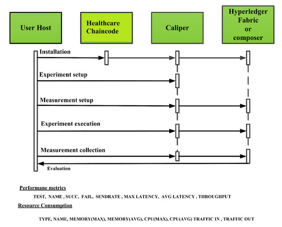 Instead of working with real systems and real hardware, this approach simulates the interaction of different components, without necessarily imitating the complete network stack. This provides a completely controlled and reproducible environment in which the experiments are conducted. Because there is no direct dependency on hardware and real networks, it is easier to scale the size of the network by varying the total number of transactions, rate control, number of virtual machines, blocksize, number of rounds, and so forth. The possibility to keep the complete evaluation on a single machine provides easier debugging and even time manipulation, which allows simulating large loads on the network. These aspects would be more difficult on other evaluation platforms and hardware because of their distributed architecture. There are different kinds of software platforms that can be used to evaluate network technologies such as Blockchain and Distributed Ledger Technologies (DLTs). We have used Hyperledger Caliper. Caliper is a benchmarking tool for Blockchain. It supports some Hyperledger Fabric Blockchain implementations and is built to be easily extensible to other technologies. In this paper, this tool is utilized to define, generate, and execute the workloads. Additionally, it also provides the on-chain metrics for evaluation. The EHR smart contract is written in JavaScript and deployed in the source file.