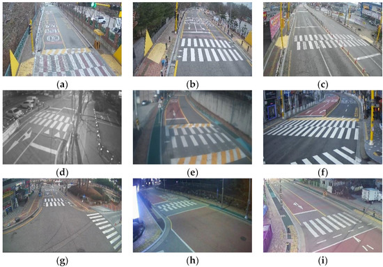 Figure 1a–i show the CCTV views being actually recorded in spots A to I, respectively. Since these spots have a high “floating population” during commuting hours, due to their proximity to schools and residential complexes, we used video recorded on weekdays from 9 to 28 January 2020, from 8 a.m. to 10 a.m., and from 6 p.m. to 8 p.m.