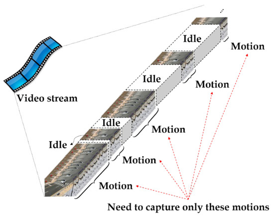 As a first step of preprocessing, we partition the video stream into only video clips with moving vehicle or pedestrian activities, regarded as “motioned-scene.” The goal of this step is to make efficient processing of video footage. In general, there are occasionally some motioned-scenes (see Figure 2), but CCTVs on the road constantly record for 24 h, so most frames are idle states. Thus, it is necessary to decide whether to process the input frame or not. Thus, it requires a method with a simple and low computational complexity to handle the video footage.