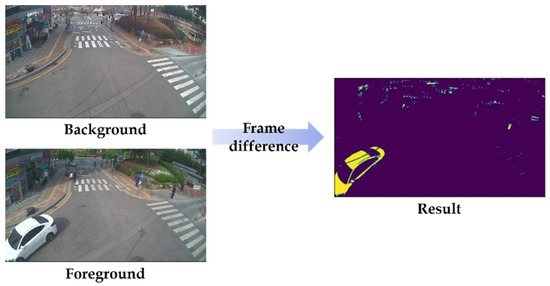For this, we apply a frame difference method, a widely used approach for detecting moving objects from the fixed cameras [25,26]. This method simply calculates the pixel-based difference between two frames, as an image obtained at the time t, denoted by I(t), and the background image denoted by B: