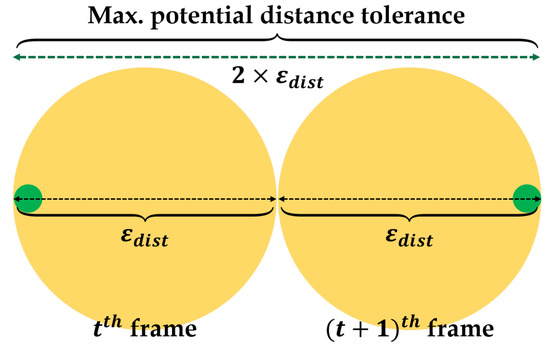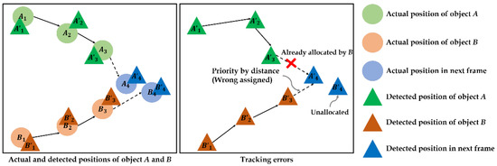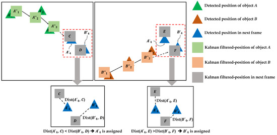 Lastly, we identify each object in a consecutive frame by using an object tracking algorithm. In our experiment, we improved an existing object tracking algorithm from our previous works using a centroid track with threshold and minimum distance methods [30]. This previous algorithm accounts for distance when postulating the location that an object can move to in the next frame, prioritizing the closest object rather than the most likely one. However, this makes some errors; other objects are regarded as having disappeared out of frame if their distance to the remaining positions is greater than the threshold. Furthermore, in the vision-based object handling process, there is noise at the positions of the detected objects, so it is difficult for the previous object tracking algorithm to cope with this issue, as illustrated in Figure 4. Assume that there are two objects, A and B, in multiple consecutive frames, and the trajectories of A and B from frames 1–3 are, so far, already connected, and are trying to correctly assign and . The circular positions mean the actual positions of each object, and the triangular ones mean the detected positions in the video by using an object detection model. In practice, the contact points of the object have a noise due to either the object detection model or contact point recognition process, so there is a slight difference between the actual object’s position and the detected position, affecting the performance of the object tracking. Thus, it is necessary to improve the accuracy of the tracking algorithm by adjusting this noise.