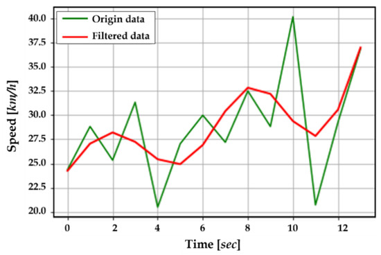 Vehicle acceleration: Vehicle accelerations and their changes during the scene are important factors to consider; if many vehicles maintain their speed or accelerate while approaching the crosswalk, this increases the risk to pedestrians. Ideally, we would expect to see cars decelerate near crosswalks, especially when pedestrians are present. In our experiment, we categorized vehicle accelerations as “acc”, “dec”, and “nc” by considering only speed changes. First, we smooth the speed sequence (see Figure 7) using a low-pass filter method, commonly used to reduce the rapid fluctuation of the signal that may result from the imprecision of object positioning from the image processing algorithm [40,41]. This results in the filtered speed list, , with the filtered values, f, where the subscripts and are scene number and object number in this scene, respectively.