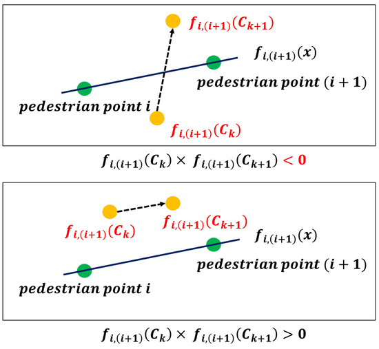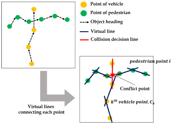 As represented as Figure 10, the process of PSM value extraction follows three steps: (1) drawing the virtual lines connecting the points of pedestrian in and frames, functionalized as linear function ; (2) multiplying function values, and where and are vehicles points, respectively; and (3) iterating steps 1 and 2 for all points in trajectories until is negative.