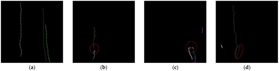 First, in order to validate the object tracking algorithm, we defined success criteria, and manually counted all scenes with trajectories of objects that violated these criteria. Figure 11a shows trajectories for correctly tracked objects. As seen in these figures, the trajectories of objects should be continuous, and two or more objects should not cross each other. In addition, since this algorithm applied a threshold method, if there are unallocated objects within the threshold range, they could be traced incorrectly. Thus, we defined three criteria as follows: