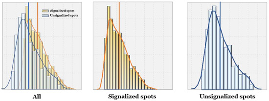 Figure 14 shows the distributions of positive PSM in all signalized vs. unsignalized spots. It represents the ranges and mean values of PSM; PSMs were higher on average in signalized crosswalks than those in unsignalized crosswalks. In addition, the peak of the distribution across all signalized spots is higher, since the traffic signal forces some time to pass before cars can cross the pedestrian’s path. Without the signal, the distribution peaks are closer to zero, indicating cars are not willing to wait and give pedestrians the safety margin before passing.