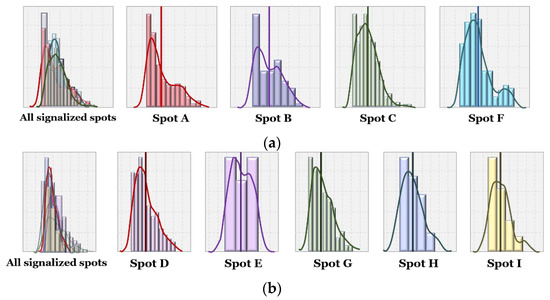 Spot C is the only location where the average speeds exceeded the speed limit (30 km/h). This may be related to the number of lanes and whether a speed camera is deployed. First, Spot C has four lanes, more lanes than any other spot except Spot F; generally, higher speed limits apply when there are more lanes, but the speed limit in Spot C remains 30 km/h because it is designated as a school zone. Second, Spot F matches Spot C in the number of lanes, speed limit, signalized crosswalk, and school zone designation, but Spot F has a speed camera, missing from Spot C (refer Table 1). From this example, we can hypothesize that when the number of lanes increases, vehicle speeds increase, but a speed camera can suppress such a tendency.