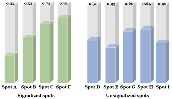 Figure 16 shows the percentages of vehicles that stopped within 10m before passing the crosswalks when pedestrians crossed the streets in signalized and unsignalized spots, respectively. First, among signalized spots, Spot A has the lowest percentage of drivers stopping. The reason could be related to the width of lanes. Spot A has just two lanes, but other signalized spots have three or more lanes. It can be interpreted that the drivers on the narrow road are reluctant to wait for the signal, so they would violate the signal. Spot F has a higher percentage than those in other spots. It can be seen that the installation of the speed camera has a deterrent force that makes the drivers obey the signal. In this experiment, we analyzed only behaviors of vehicles and pedestrians, not considering signal phases together. Note that the coexistence of the passing vehicle and crossing pedestrian implies that one of the traffic participants violates the traffic signal threatening driving safety regardless of the signal.