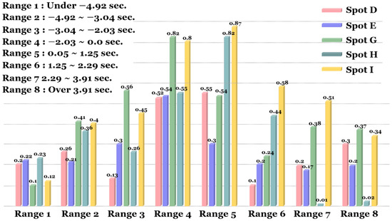 In Figure 18, ranges 1, 2, 3, 6, 7, and 8 are relatively distant groups from zero, and ranges 4 and 5 present the greatest risk, with safety margins within 1–2 s. We can observe that as margins increase, vehicles are less likely to stop at the crosswalk.
