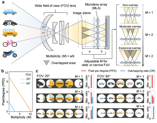 A focused light-field camera (LFC) captures a light-field (LF) image by placing the image plane formed from the main lens on the object plane of the micro-lens array (MLA) and projecting it to the image sensor. As shown in Figure 1a, each micro-lens acts like an individual camera and the image objects of adjacent micro-lenses overlap each other on the image plane. By applying stereoscopic to these overlapped images, 3D information can be acquired through various image processes [11,28]. The overlapped area between micro-lens images depends on multiplicity (M) = a/b, which is the ratio of the distance a between the image plane and the MLA and the distance b between the MLA and the image sensor. In the case of M = 1, the overlapped area does not exist, and the LFC system behaves like a conventional camera, simply acquiring 2D images without light-field information. In the case of M being similar to 2, the LF function is possible by overlapping half of the adjacent micro-lens images to cover the entire image transmitted through the main lens. For M higher than 2, the overlapped area is more than half of the adjacent micro-lens image and further extends to the micro-lens image beyond the adjacent cell, which can be utilized as a larger baseline in triangulation. As M increases, the coverage in a single micro-lens image expands, and consequently, the pixel per degree (PPD) tends to decrease (Figure 1b). Since PPD is inversely proportional to the FOV of the main lens, at a higher FOV, the range of M adjustable with PPD is relatively lower than that of lower FOV. Thus, for objects at the same distance, the PPD of FOV 20° is three times greater than the PPD of FOV 60°. Figure 1c shows schematic images of individual lenses with maximum ratios of PPD and overlapping ratio (OR) according to several M (1, 2, and 4) in each wide (60°) and narrow (20°) FOV. At 20° FOV, LF image can be acquired by depth estimation with low error with the high overlapping ratio at a relatively high resolution due to a decent maximum ratio of PPD even at relatively high M. On the other hand, at 60° FOV, as M increases, the maximum ratio of PPD sharply decreases, so the resolution of depth information becomes too low, which causes a large error in-depth estimation. Therefore, a compromise in overlapping ratio with a relatively low M is required for an adequate level of PPD at high FOV.